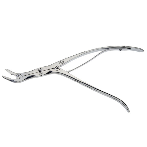 Bone rongeur with original STILLE double-action joint and sideways strongly curved 2 mm jaws.